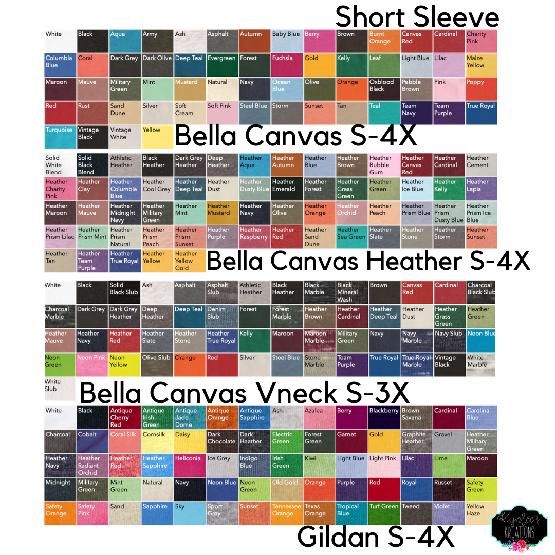 PLEASE verify your shirt color/style/size correlate with the color charts. On the color charts, you will see the colors available. Directly below will be the style and sizes available in those colors. Not all colors are available in the same brands...not all sizes are offered in the styles shown. No refunds will be given due to incorrect style or color choices.