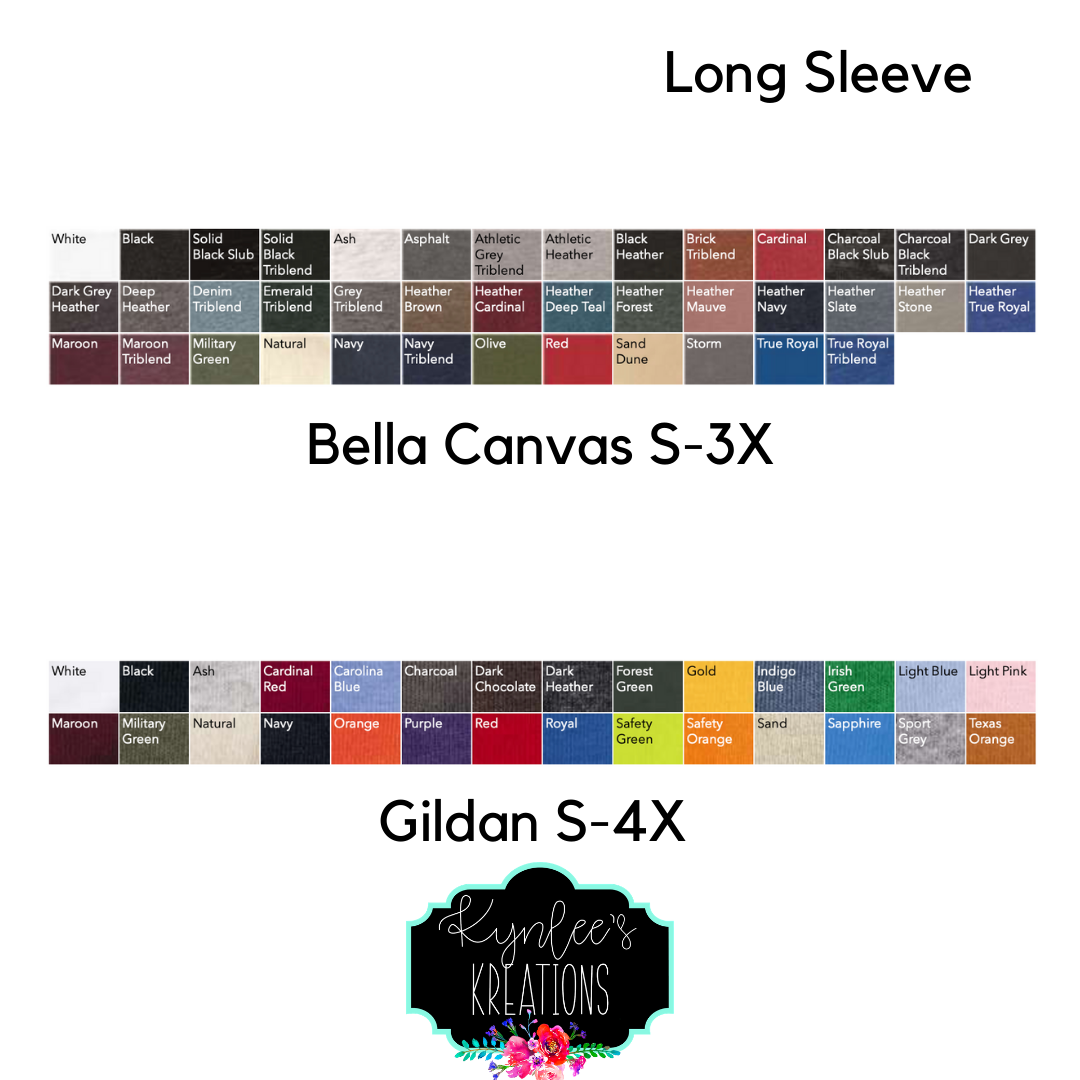PLEASE verify your shirt color/style/size correlate with the color charts. On the color charts, you will see the colors available. Directly below will be the style and sizes available in those colors. Not all colors are available in the same brands...not all sizes are offered in the styles shown. No refunds will be given due to incorrect style or color choices.